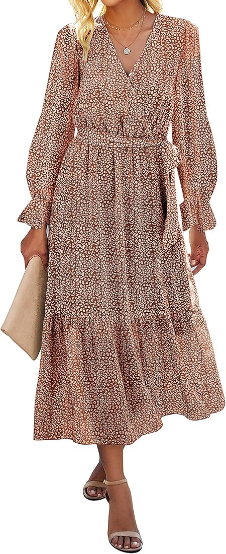 PRETTYGARDEN Women’s Long Sleeve Bohemian Dress V-Neck Floral Print High Split Tie Wrap Midi Flowy D